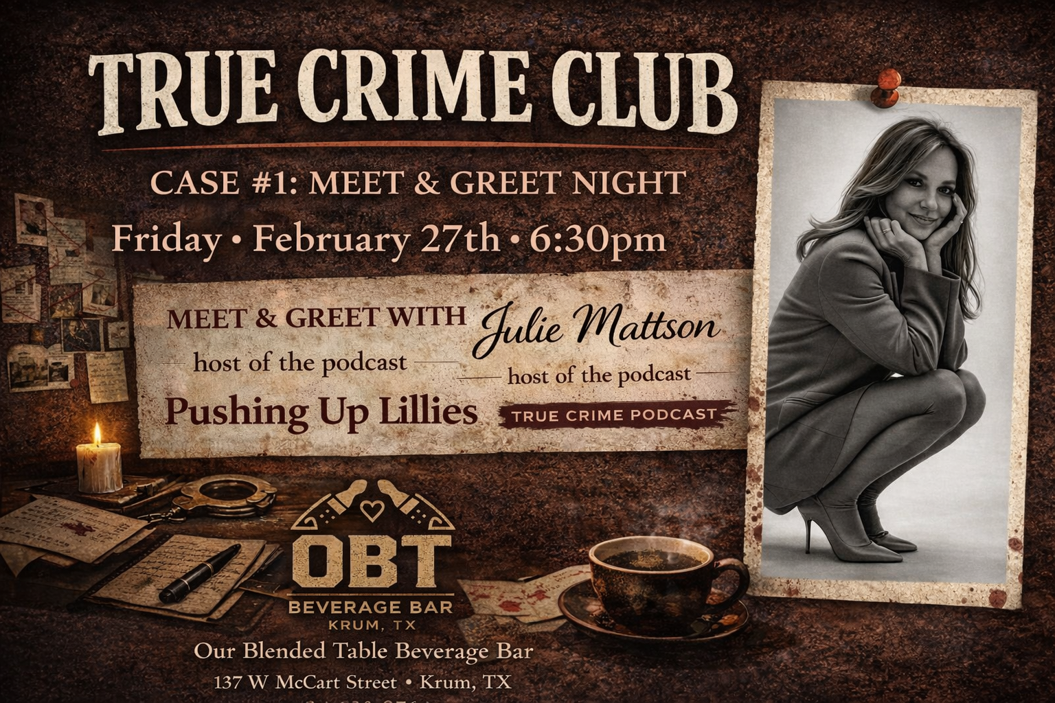 We’ll be sipping crafted cocktails, diving into compelling cases, and pouring over the evidence together with fellow true crime fans. I’m excited to meet you in person and share behind-the-scenes insight from my work as a forensic nurse death investigator, along with stories from my Pushing Up Lilies podcast.